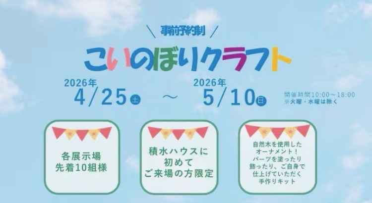 2026/04/29ハウスメーカー 【積水ハウス】こいのぼりクラフト製作♪ 4/25(土)~5/10(日)まで開催しています。※お子様お一人につき1個製作できます詳しくはこちらからhttp://www.sekisuihouse.co.jp/event/detail.php?id